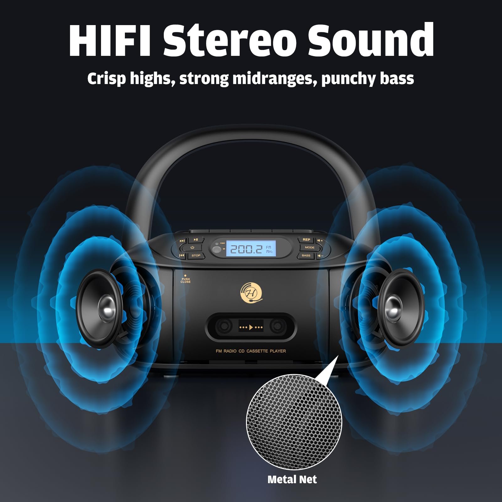 Details: CD cassette player combo (product size: 9.3 x 8.6 x 4.6 inches)