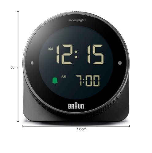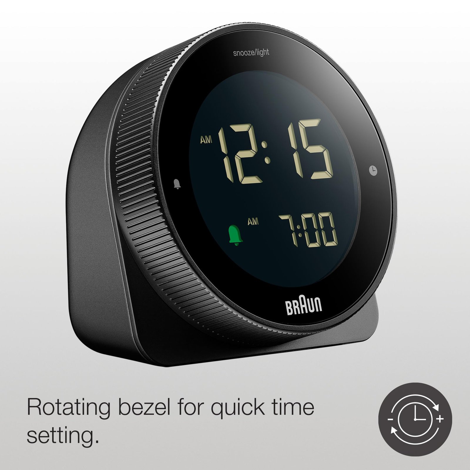 Details: Digital Alarm Clock with Rotating Bezel for Quick Time Setting – Black
