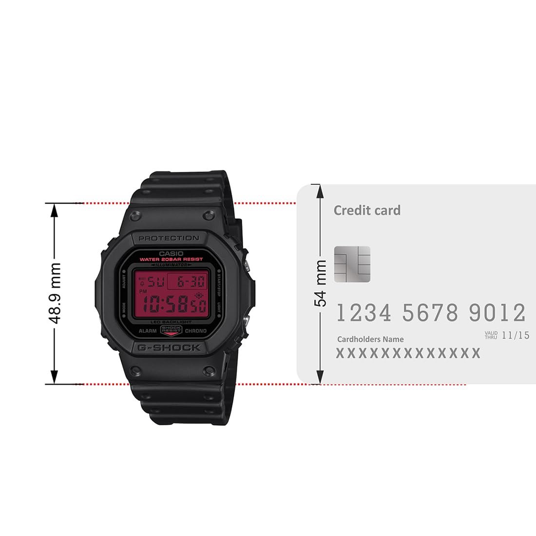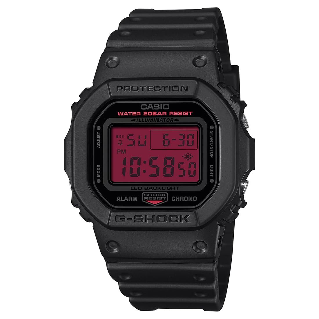 Go bold, tough, and intense, with the G-SHOCK black and red collection. The vibrant, high saturation red of the LCD really pops against the black bezel and band, not only enhancing visibility but also pushing the envelope of daring design. Activate the backlight to light up the digital display for even better visibility. Make a unique statement in all black, with a touch of bold red.