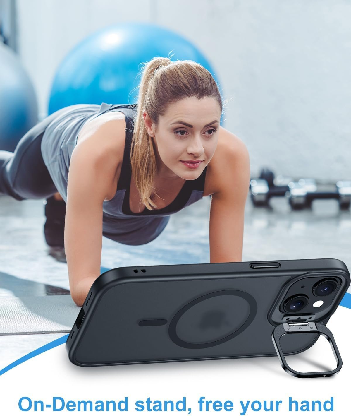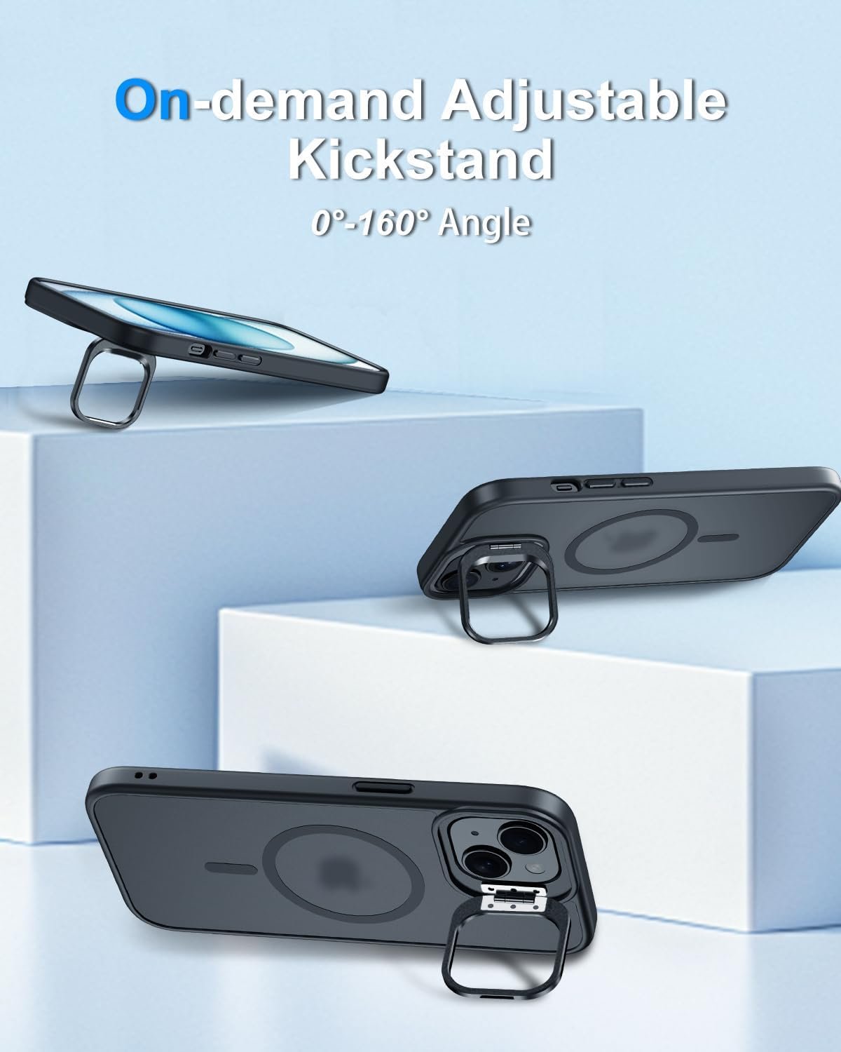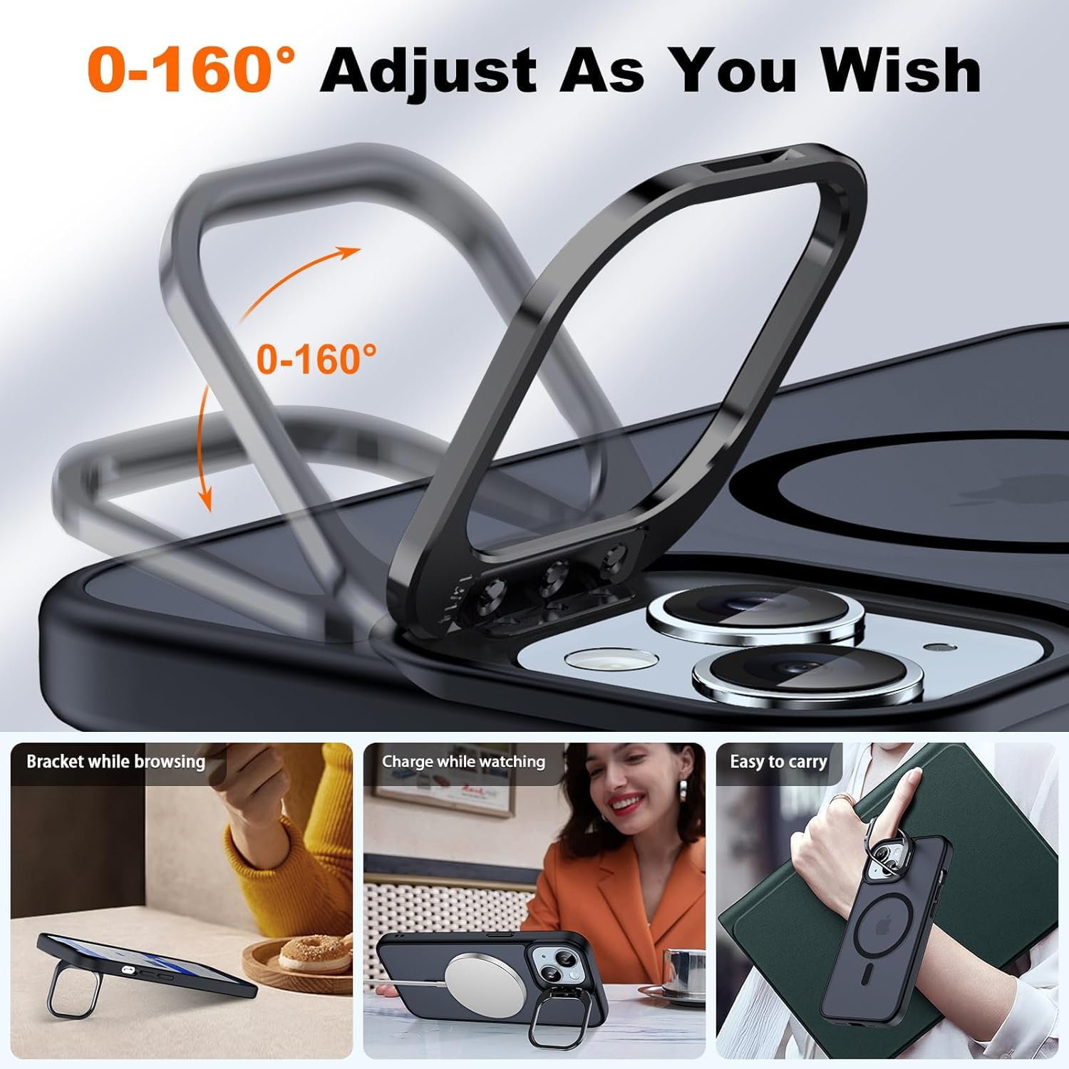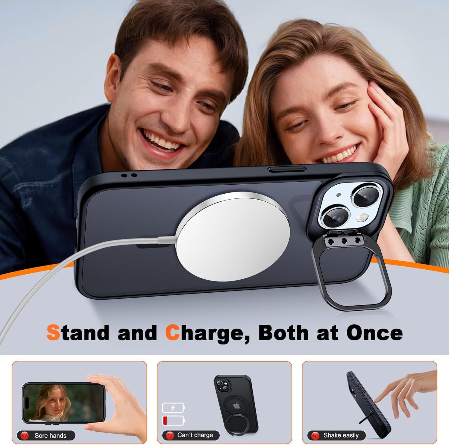 Details: Egotude Stand Case designed for iPhone 15 and iPhone 14. Made with a unique hidden stand feature and a magnet ring at back which strongly attach to wireless charger. Once snap on, never sliding. Compatible with all accessories, such as wallet, ring holder and power bank. It is equipped with shock absorption Air corners technology, provided with perfect protection for your phone. The air technology bumper protects the phone from high falls (10 feet drop tested).