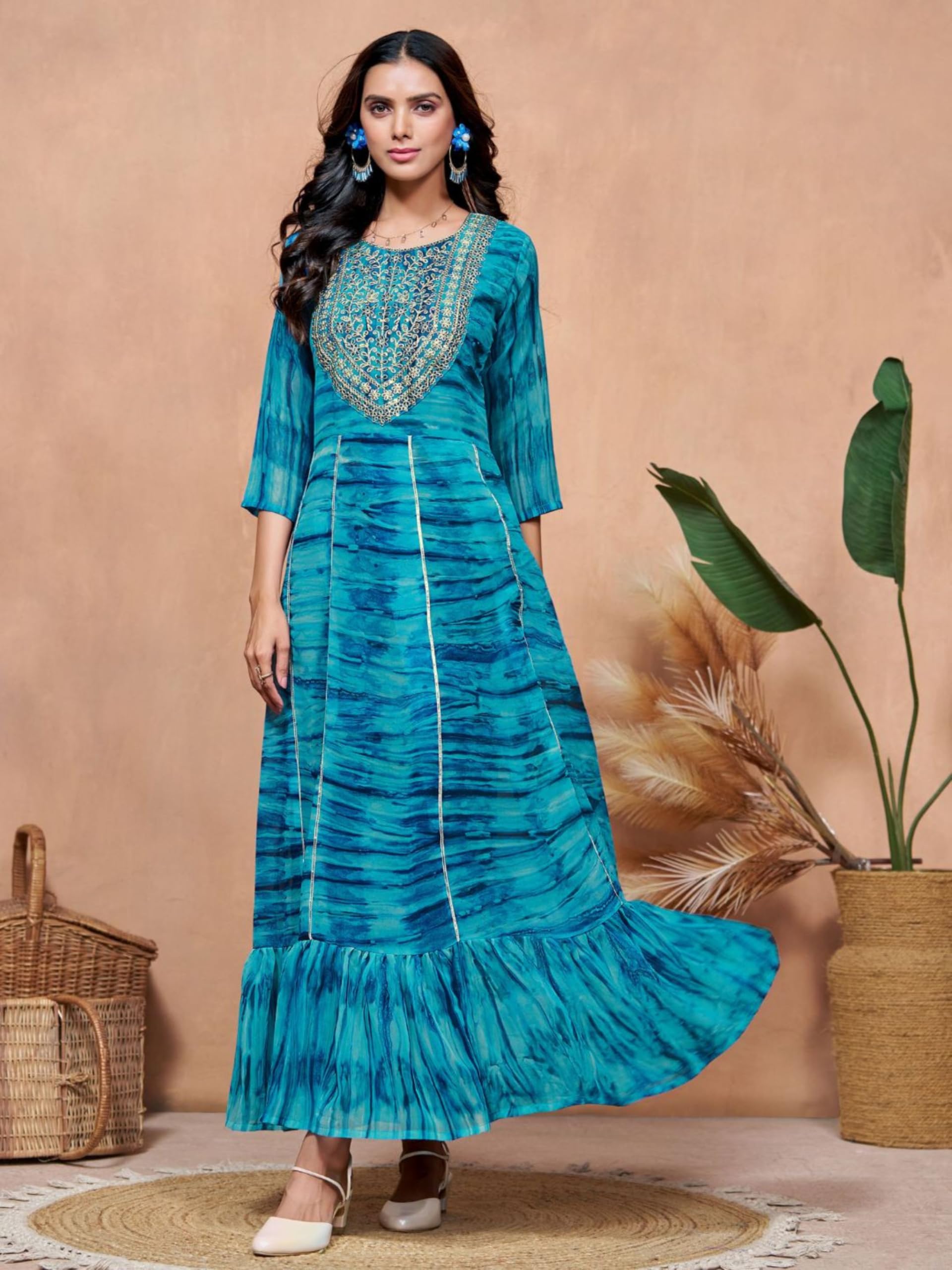 • Dress Fabric : Georgette | Dress Style : Anarkali Dress| Dress Work : Digital Print / Embroidery | Dress Color : Blue