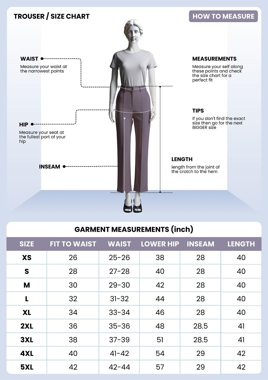 - Size Recommendation: Please use the infographic size chart guidance to determine your perfect size for women trouser; a size large is recommended for a comfortable fit.