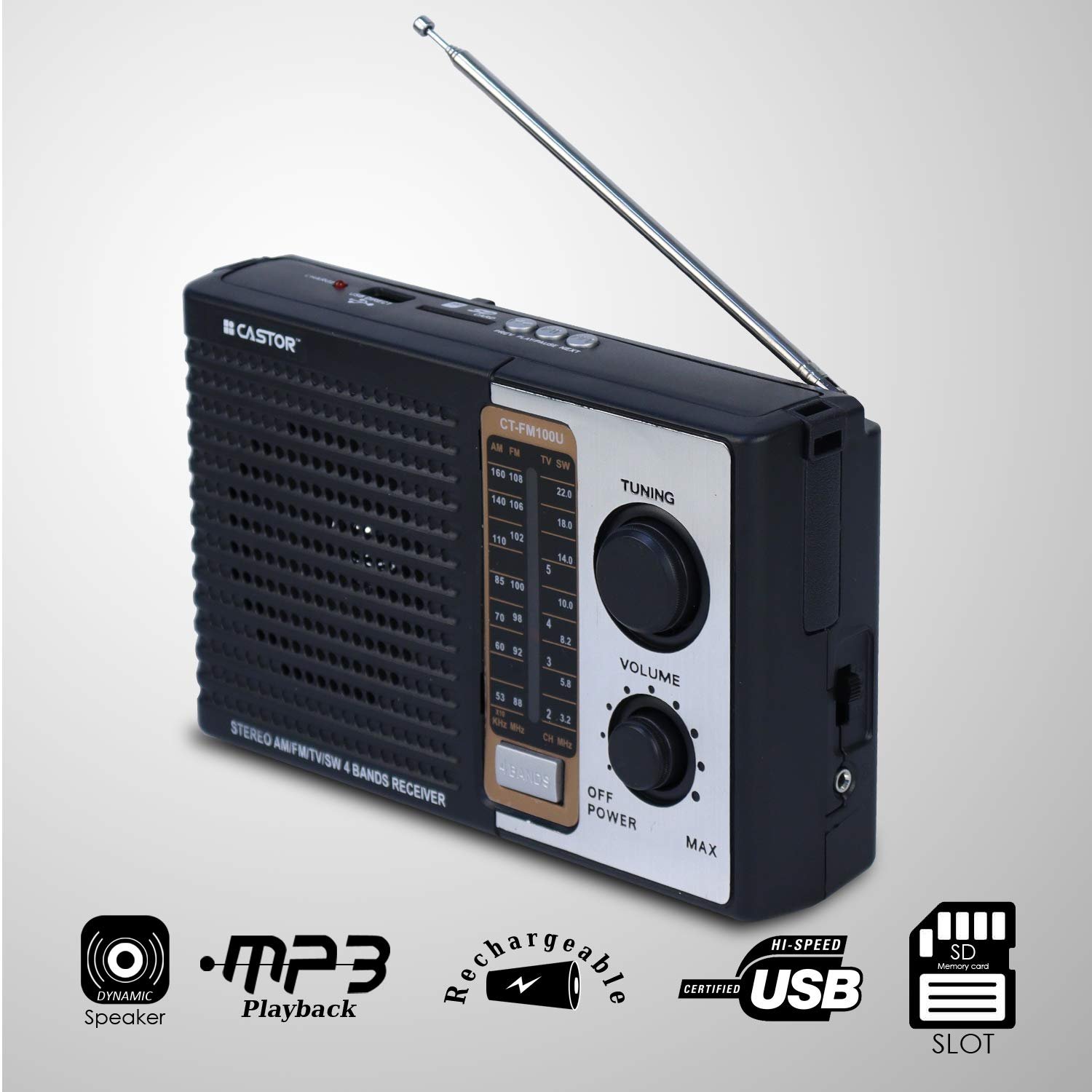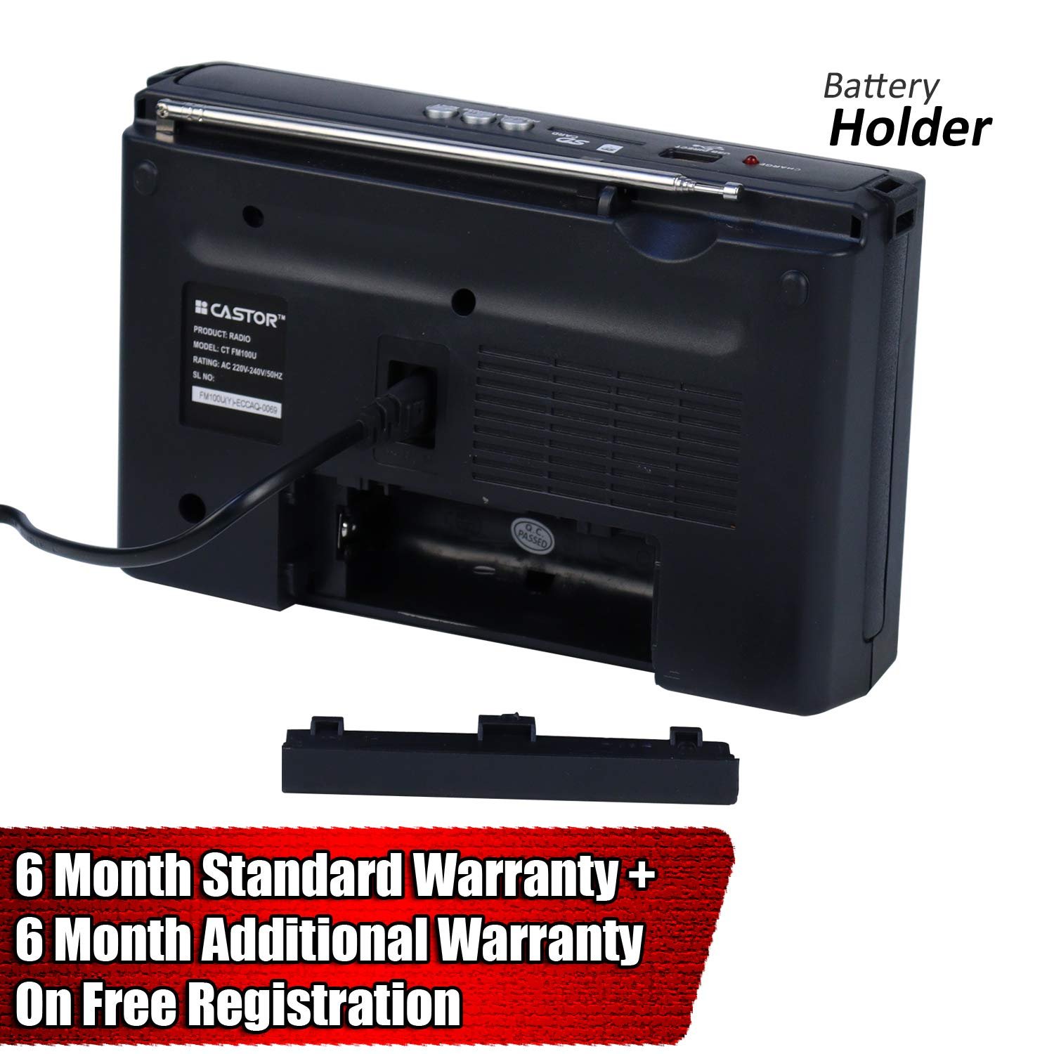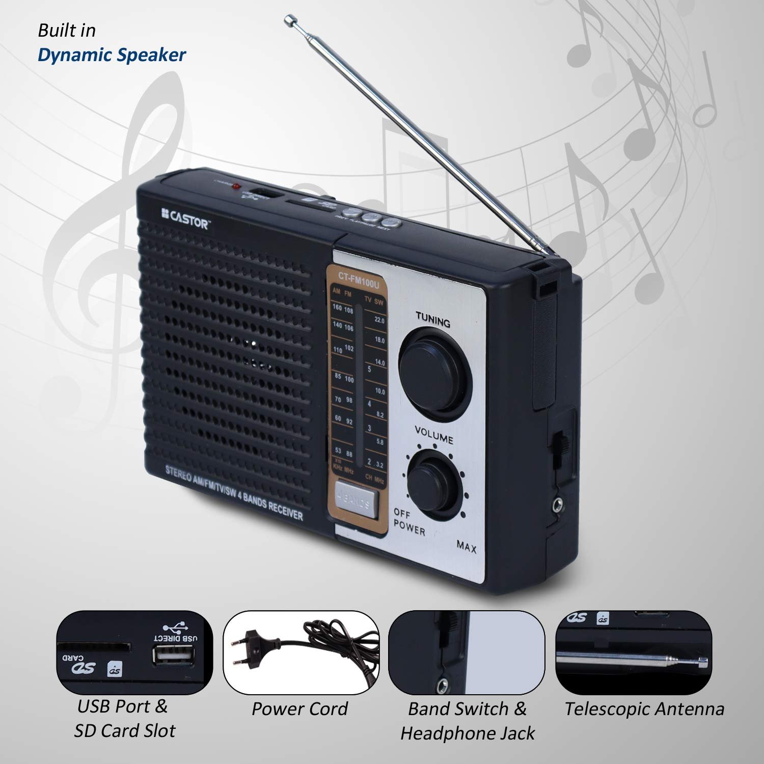 Details: CASTOR doubles up as your home radio. You can also enjoy your personal collection of songs by plugging in a USB drive or streaming songs from your SD card. It works on a rechargeable battery that lasts up to 8 hours. The product is backed by an all India service network, providing 12 months in-home warranty support. Each Channel can be selected by turning a jog-dial. So literally, with a simple turn of the knob you can receive 3 Band.