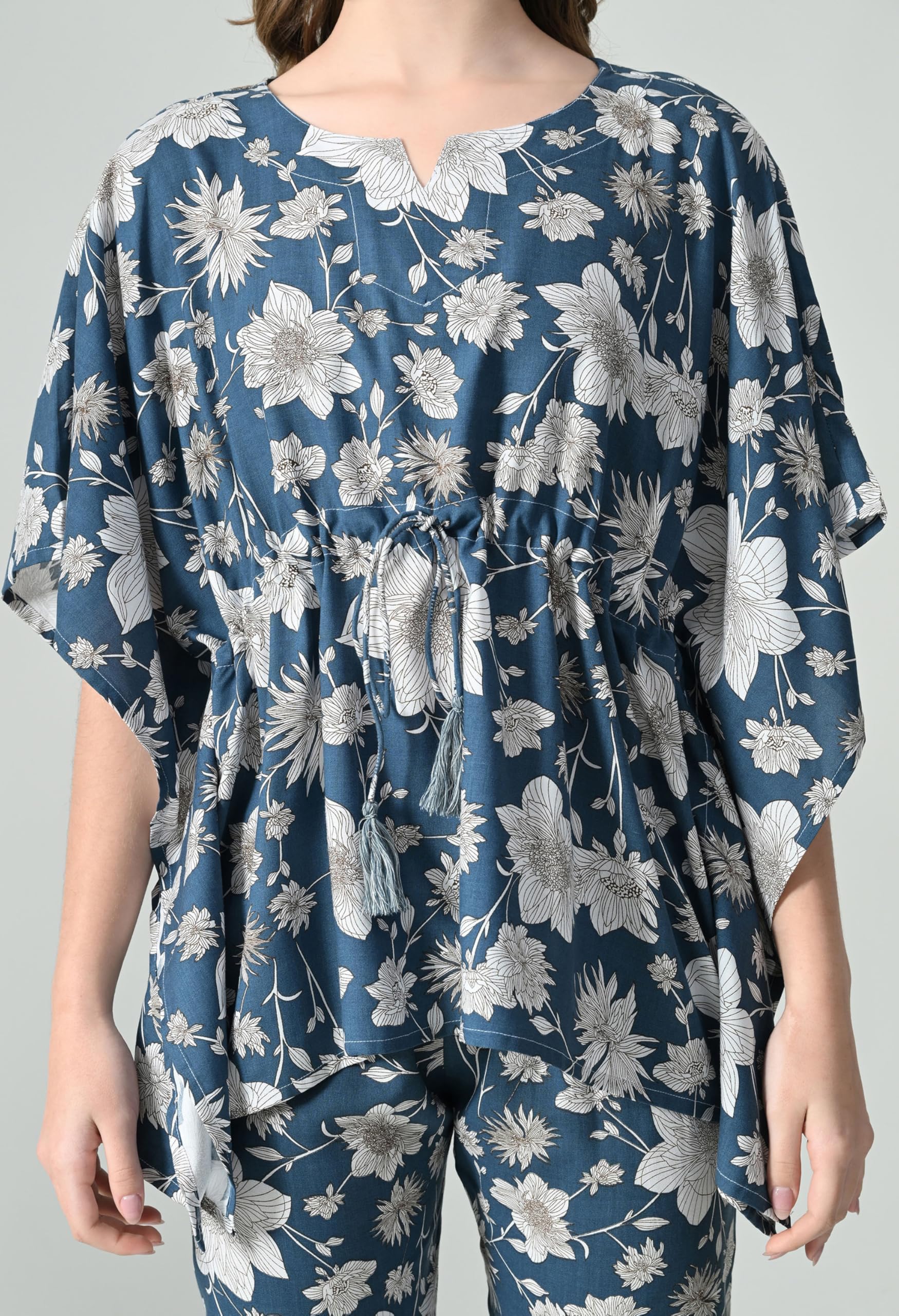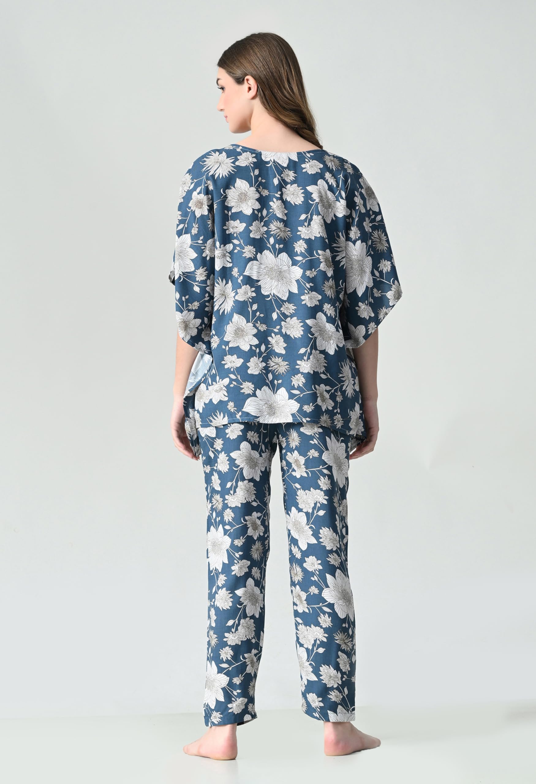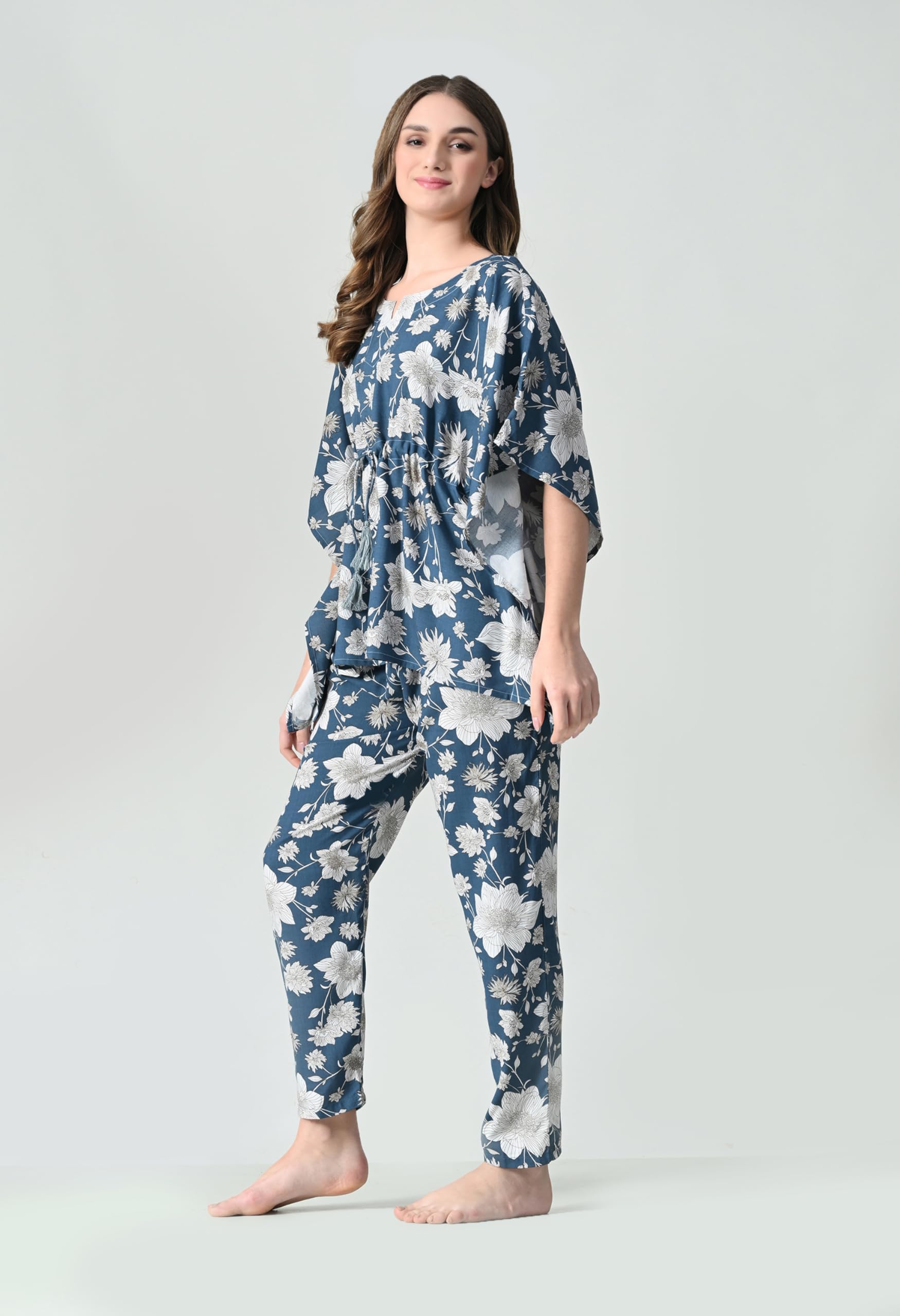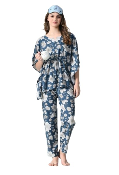 This Women’s Printed Night Suit Set is the perfect blend of style, comfort, and relaxation. Crafted from soft, breathable rayon fabric, it offers a smooth and silky feel against the skin, ensuring a cool and comfortable sleep throughout the night. The set includes a chic kaftan-style top with a classic round neck, providing a relaxed, flowy fit that allows for easy movement and ultimate comfort. The beautiful printed design on the top adds a touch of elegance and vibrancy, making it as stylish as it is cozy. The matching pajama bottoms feature an elastic waistband for a snug and adjustable fit, while also providing a relaxed, loose silhouette. A practical side pocket on one side of the bottom adds convenience for storing small essentials. Ideal for lounging at home or winding down for bed, this night suit set is perfect for those who value both comfort and style. It’s also a thoughtful gift choice for any woman who loves to unwind in chic loungewear.