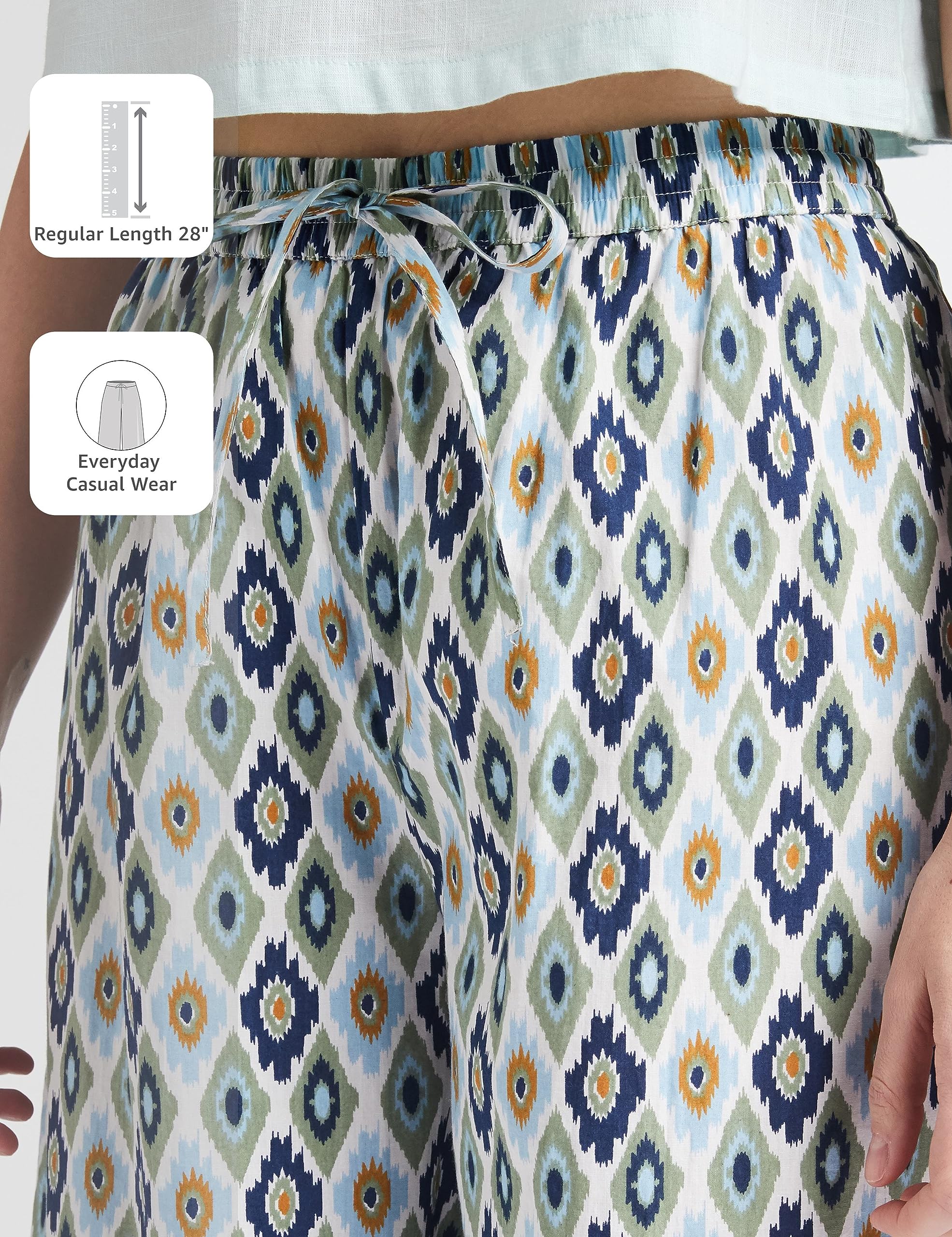 - PRODUCT DETAILS: Ankle length, flared fit featuring all over screen print with elasticated waistband and waist tie-up.