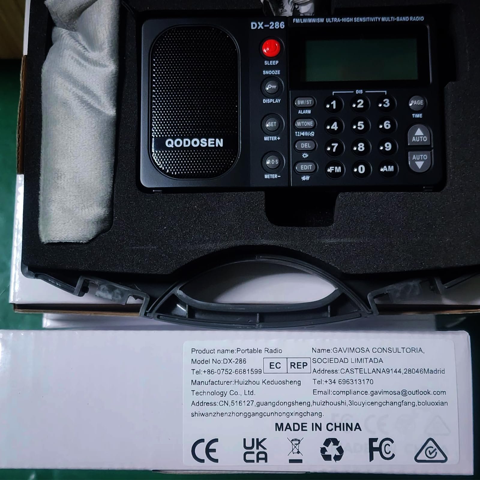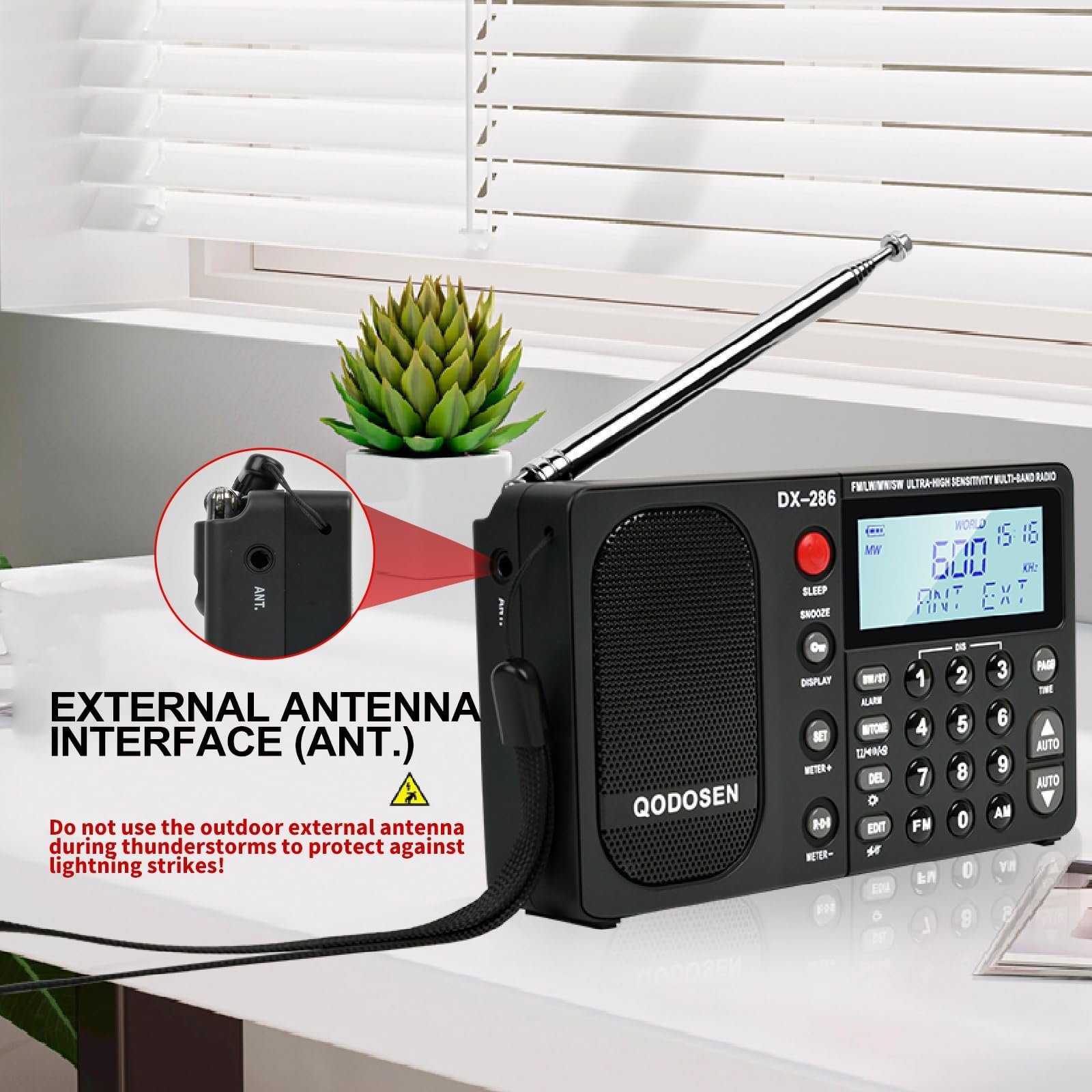 Details: QODOSEN DX-286 is an ultra-high sensitivity multi-band (FM/LW/MW/SW) portable radio, adopting TEF6686 DSP car radio chip, built-in AM band (LW/MW/SW) low-noise amplifier, the full-band supports external antenna reception and antenna attenuation, and the LW/MW supports switching between the external telescopic antenna and the built-in ferrite rod antenna. The speaker and headset adopt independent bi-amplifier design, and the speaker is a full-range speaker.