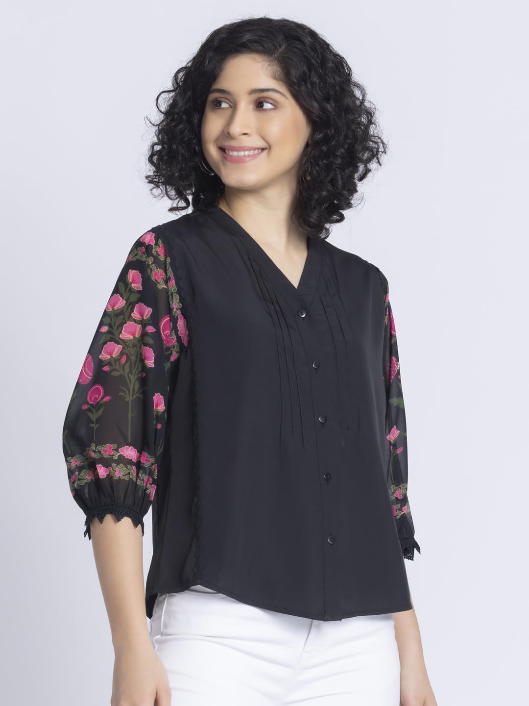 Black floral print v-neck three-quarter sleeves button down top has lace detail at front and sleeves with gathers detail at sleeves