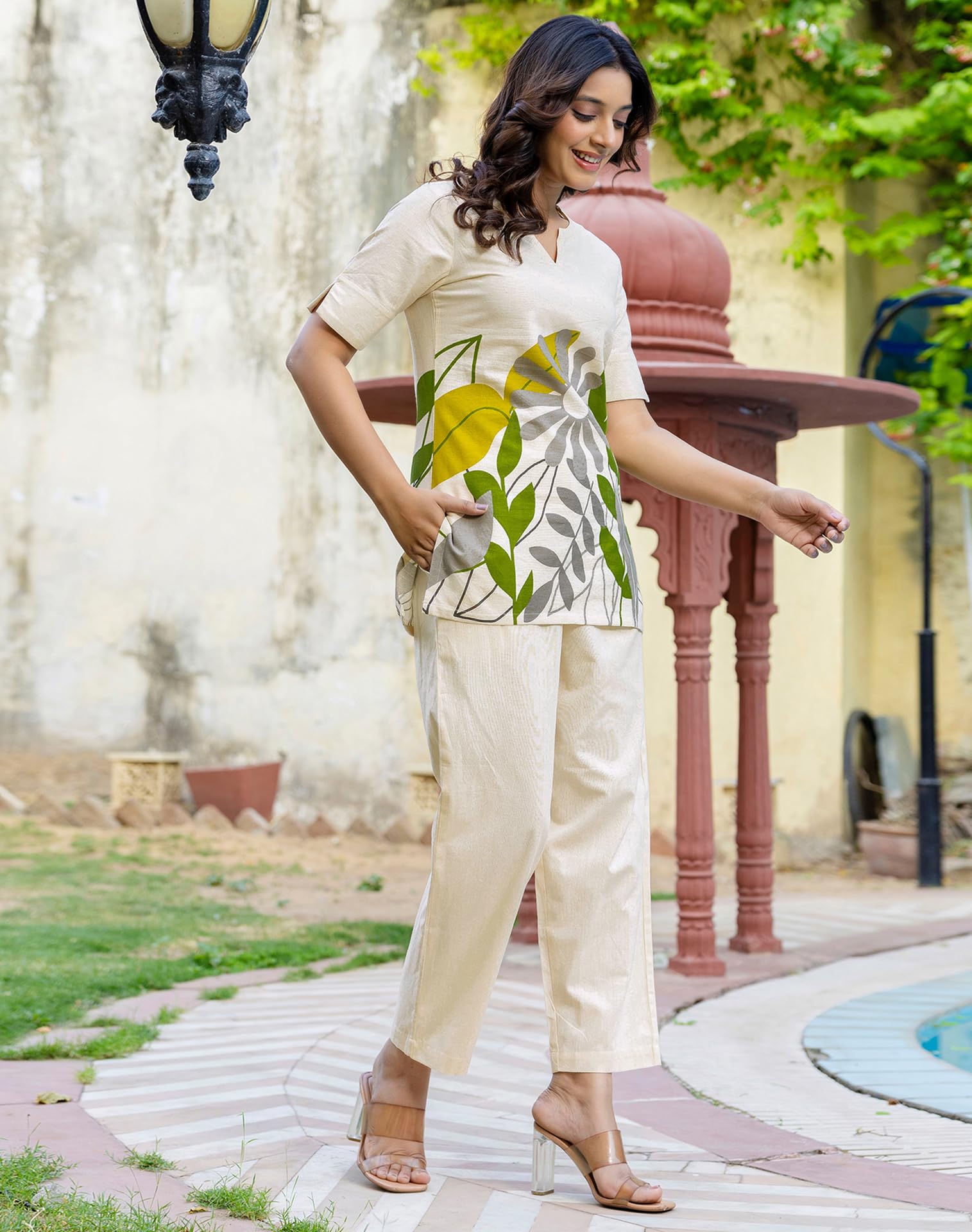 - Fabric : Cotton || color : Beige || pattern : Printed | crafted from soft, breathable material for all-day comfort in our latest design co-ord set for women